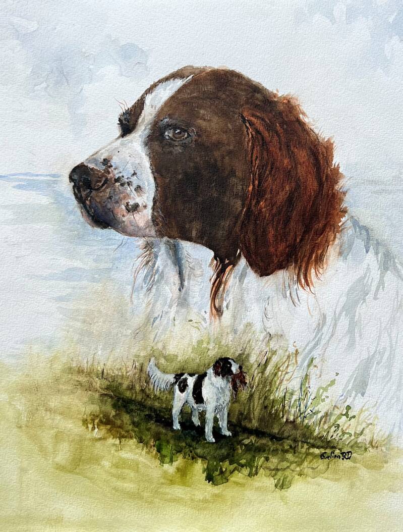 4 generatie's Drentsche Patrijshonden op 1 papier 300 grams, aquarel 50x70 cm